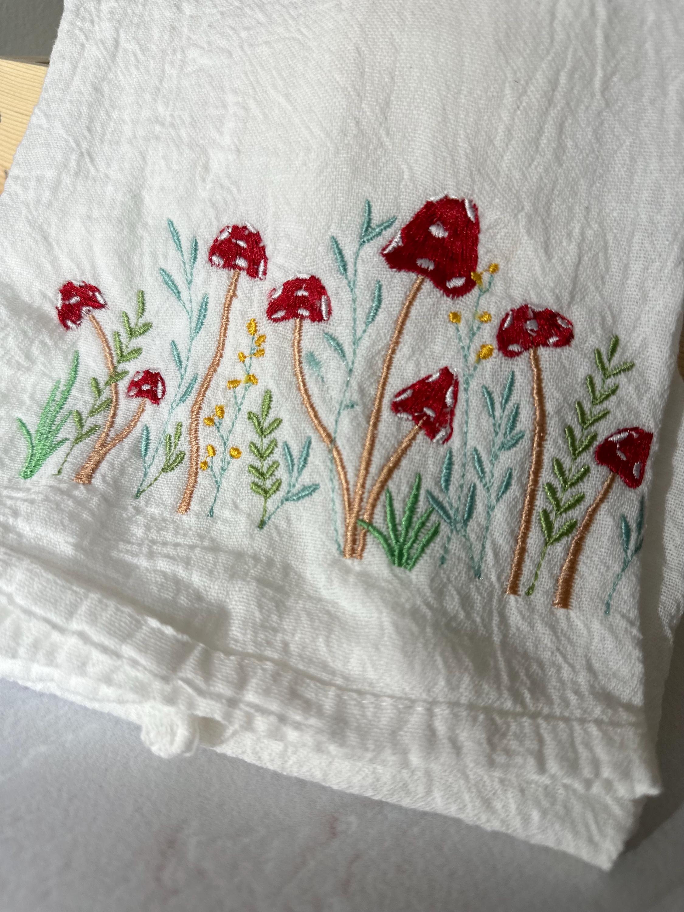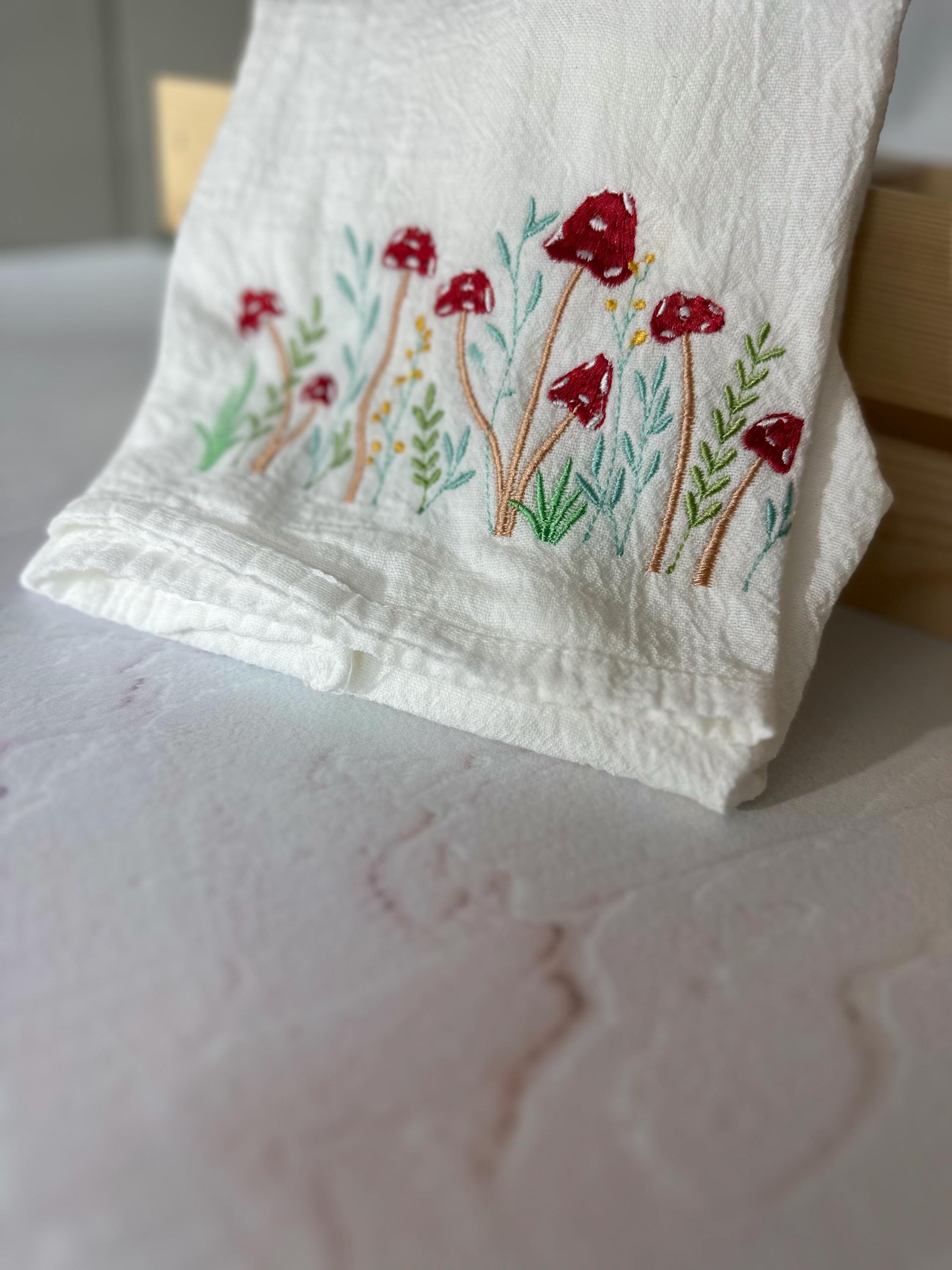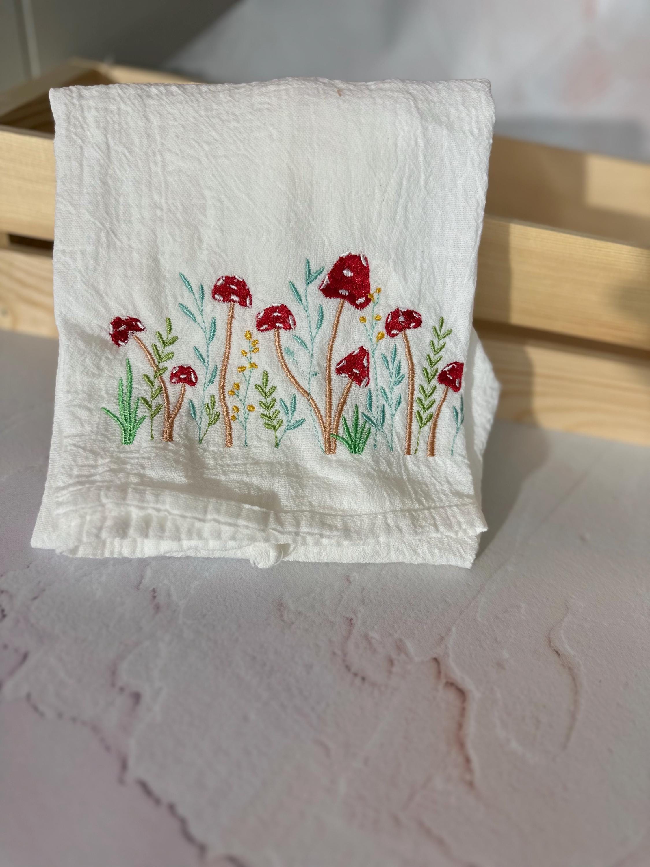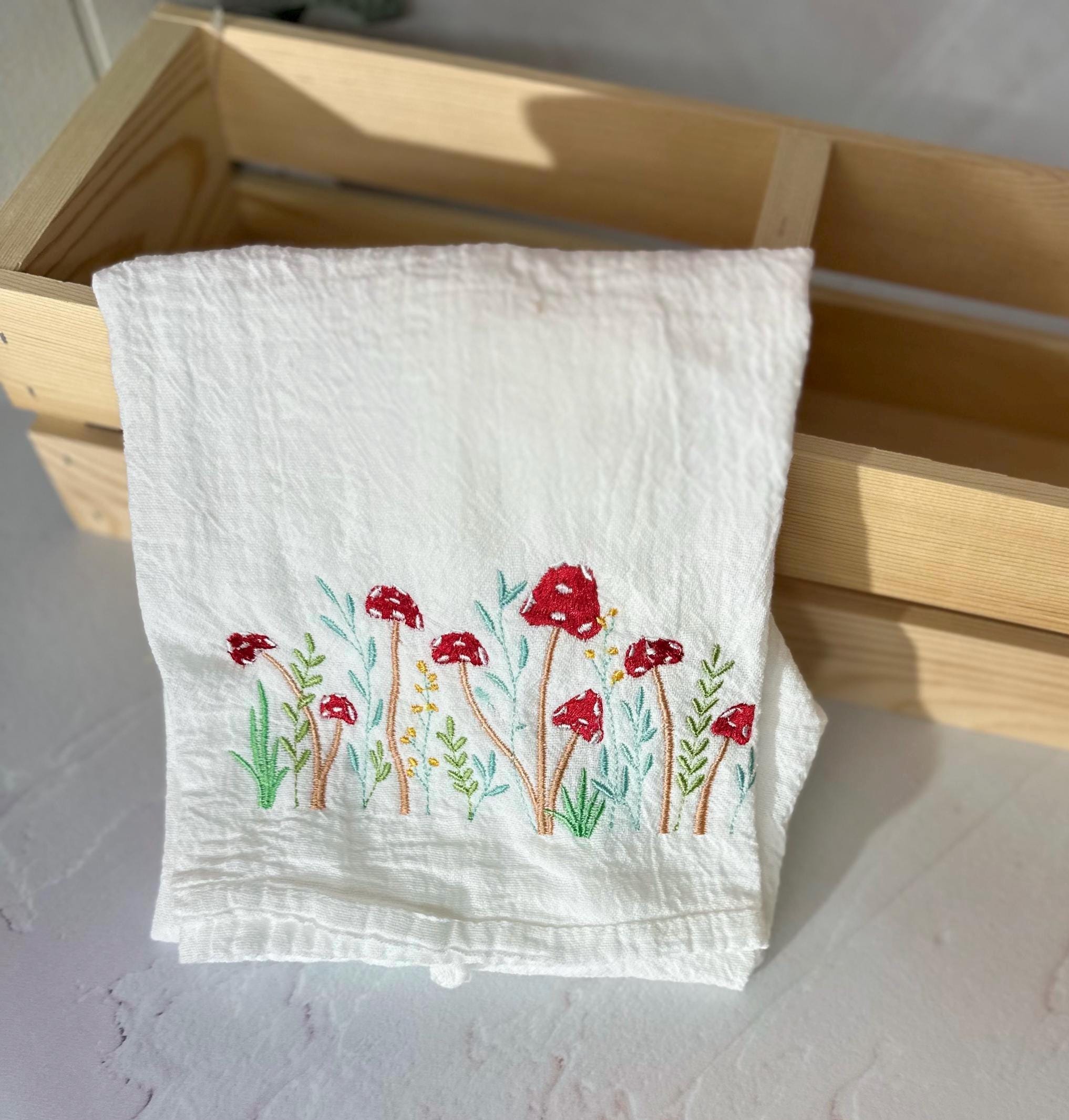 The Mushroom Garden embroidered hand towel is an exquisite addition to any kitchen, combining functionality with charming aesthetics. Crafted from high-quality materials, this tea towel features a delightful mushroom design that embodies the essence of cottagecore style, making it an ideal gift for hostesses or a lovely treat for oneself. Its soft texture and absorbent nature ensure practicality, while the intricate embroidery adds a touch of elegance to your culinary space.