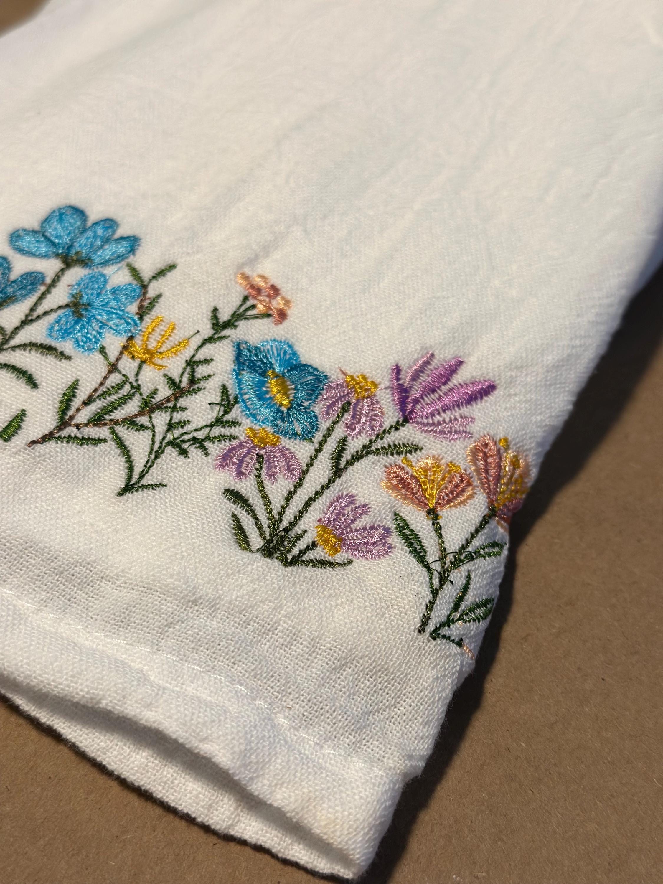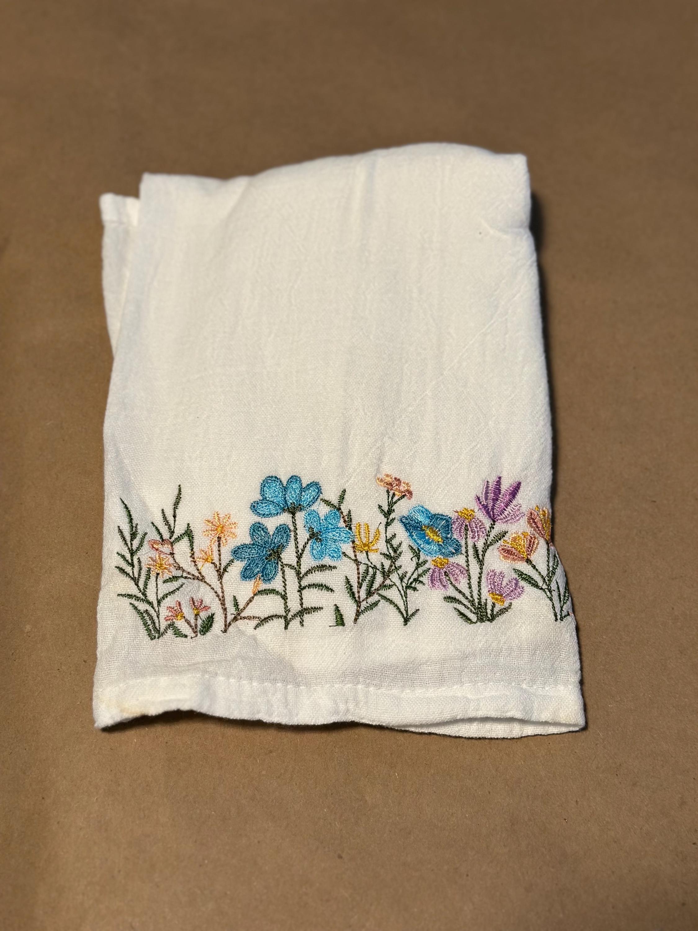 Bring the beauty of the meadow into your kitchen with this embroidered tea towel featuring delicate blue and purple wildflowers. Each stitch captures the charm of nature, making this towel both functional and decorative.
