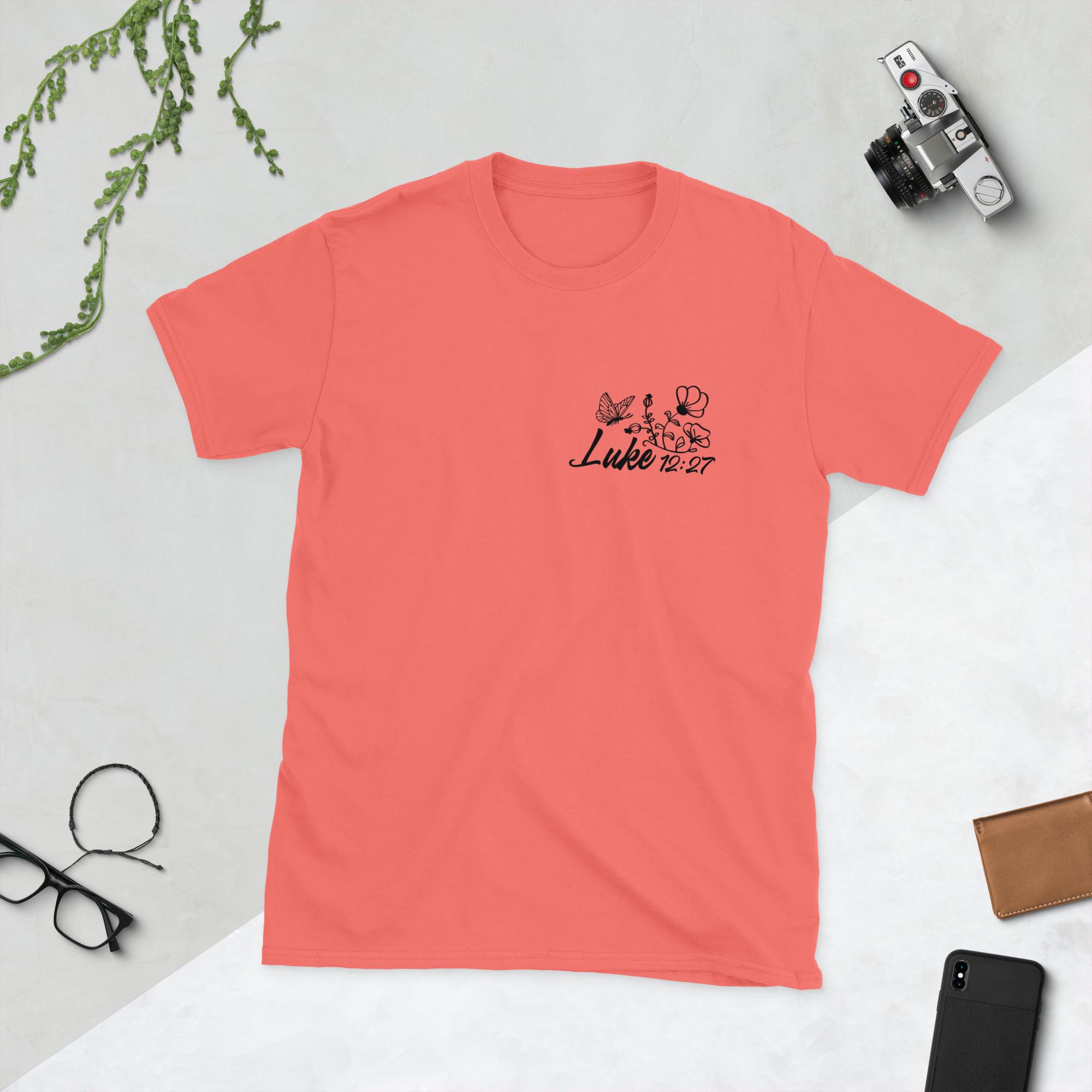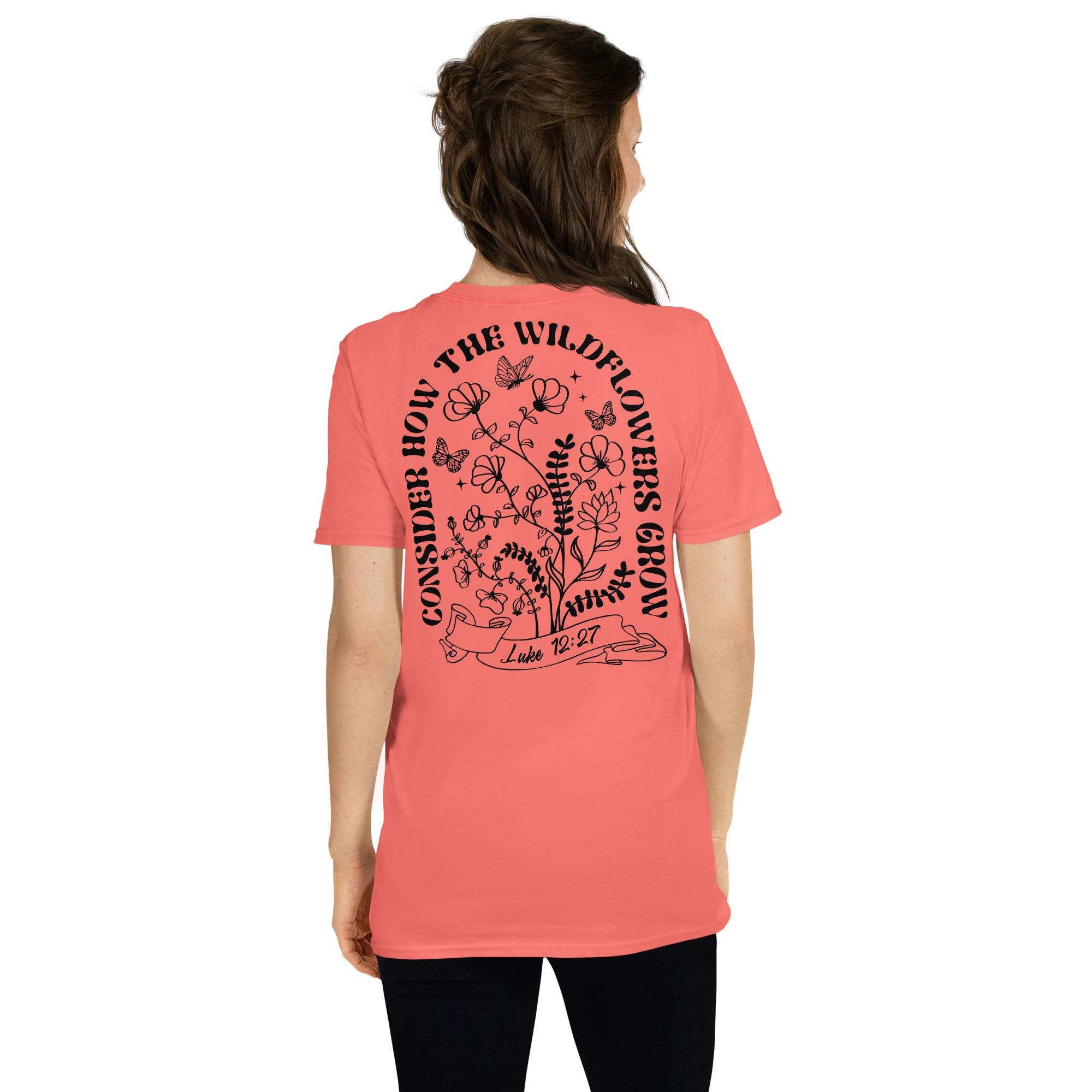 Wrap yourself in cozy comfort and encouragement with this Supersoft Gildan Tshirt featuring Luke 12:27: “Consider how the wildflowers grow.”